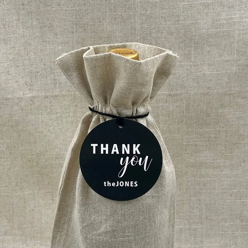 Gift tags are a quick easy way to show style and elegance. The 100 lb. white paper gift tags are 2.6" wide in diameter with a small hole punched at the top. There are 10 round tags per pack. They will allow you to attach the tag to any special gift or bottle of wine you are taking to friends or family. The string may differ from the example. Add to cart to personalize.